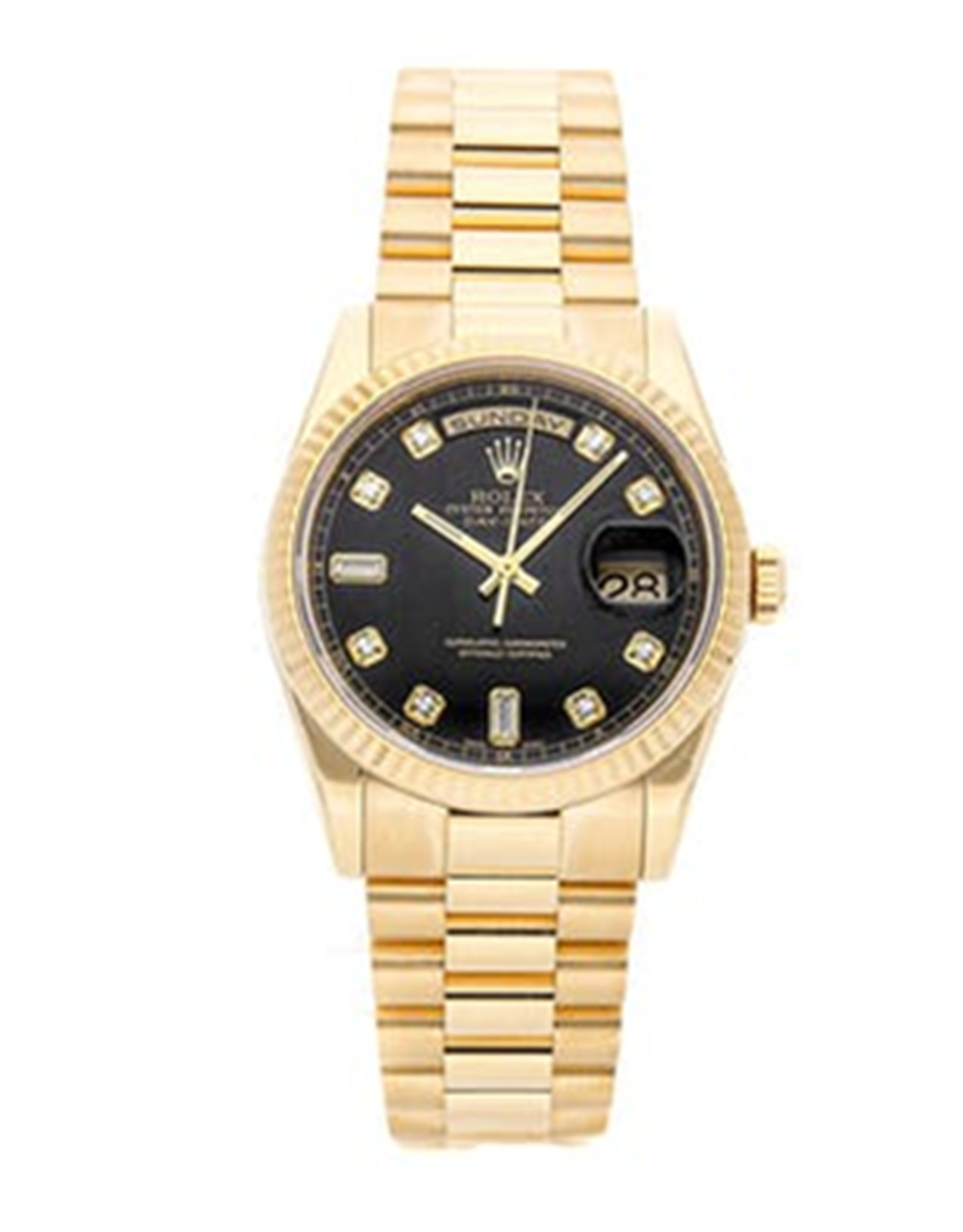 Replica Rolex Day Date Automatic watch Features Yellow Gold Case With Fluted Bezel Black 36 MM