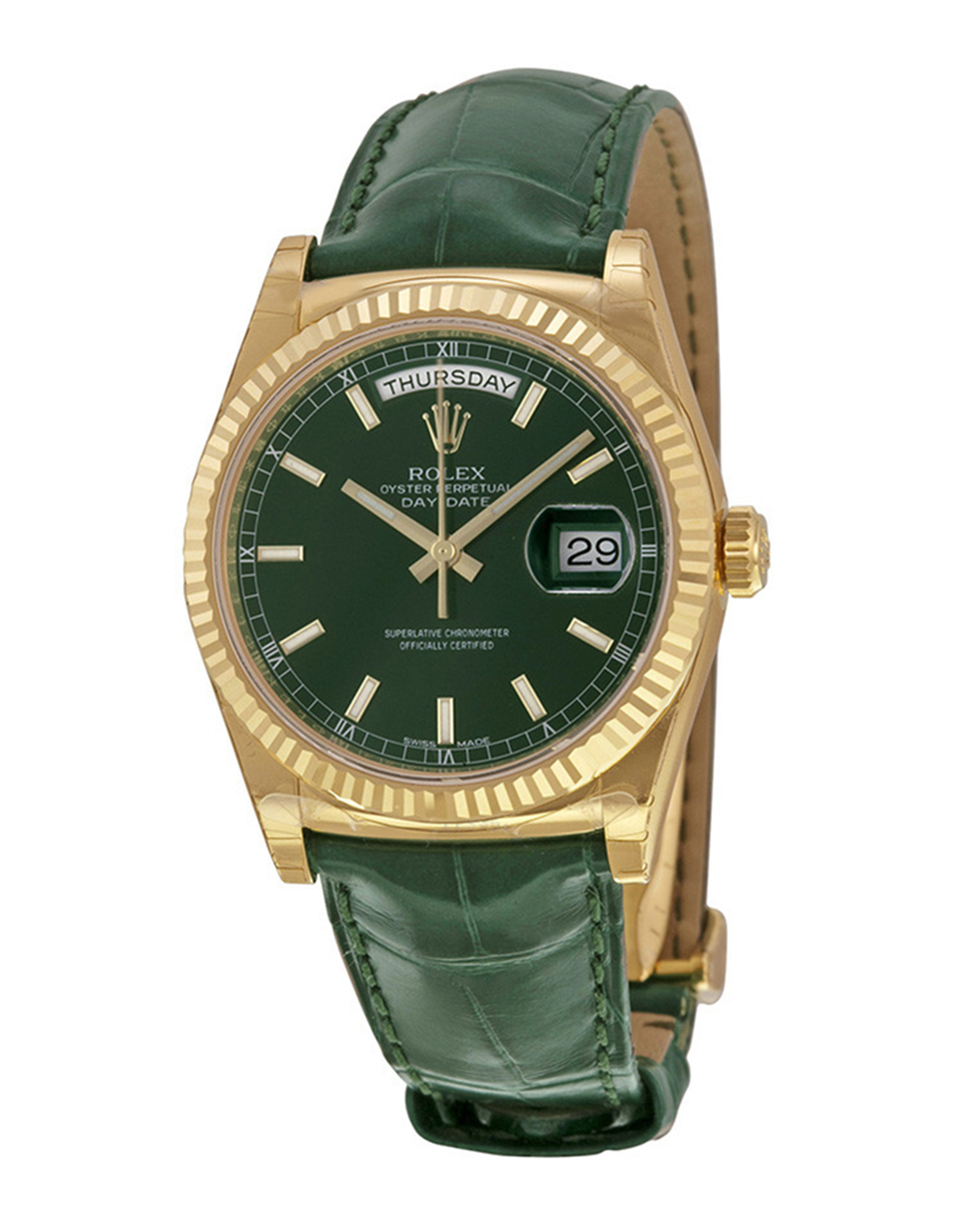 Replica Rolex Day Date Green Dial 18K Yellow Gold Leather Men’s Watch 36 MM