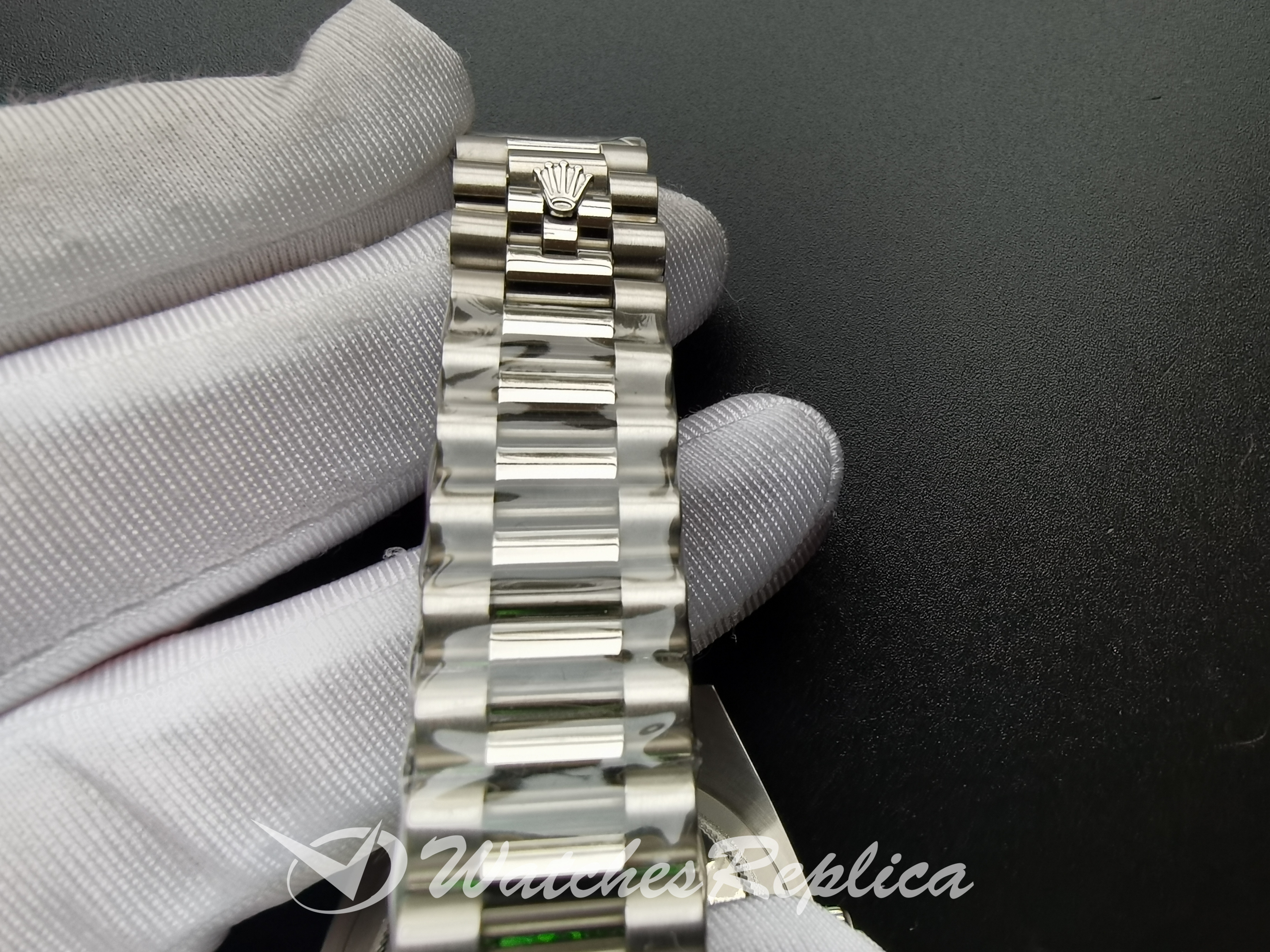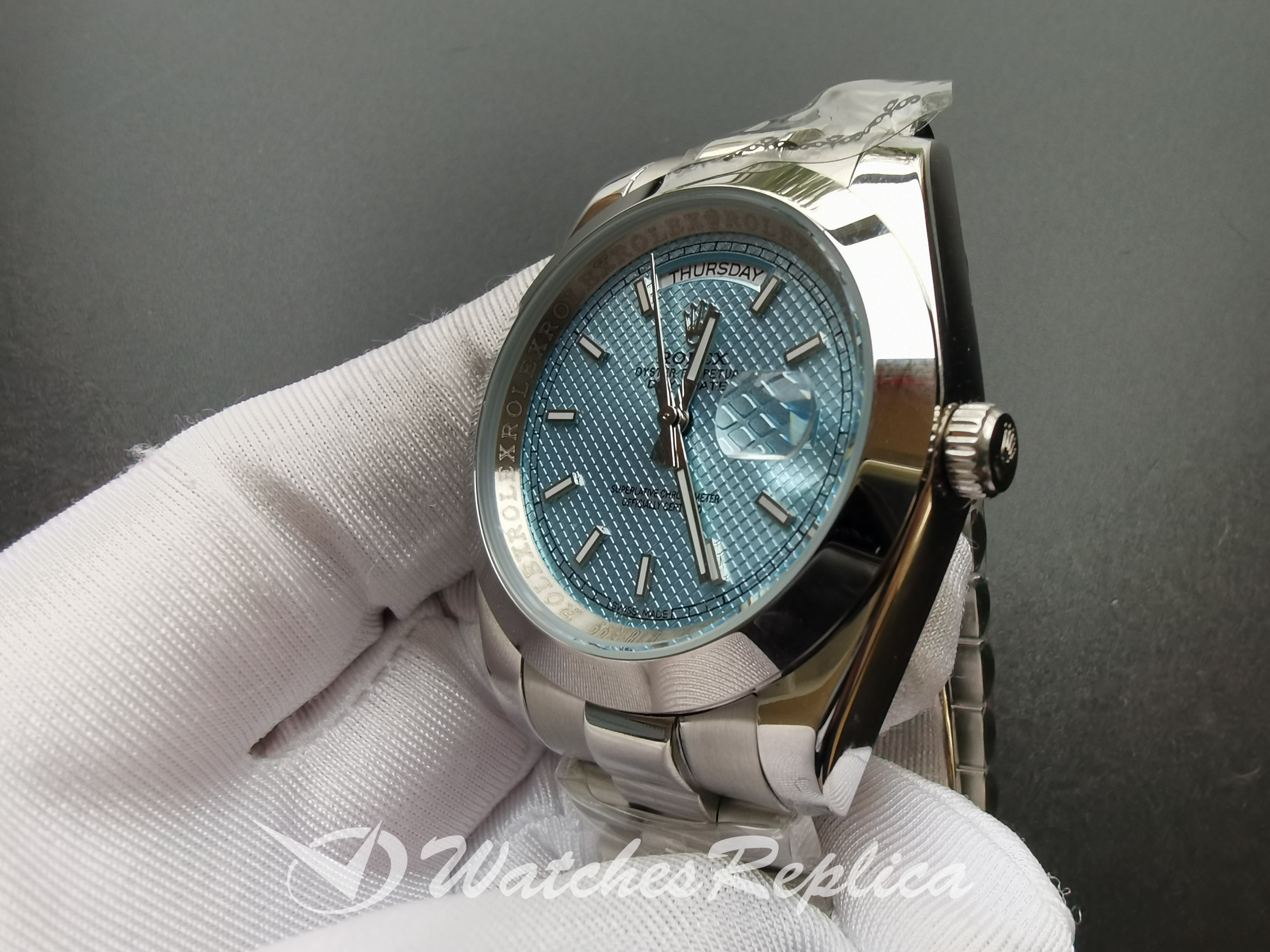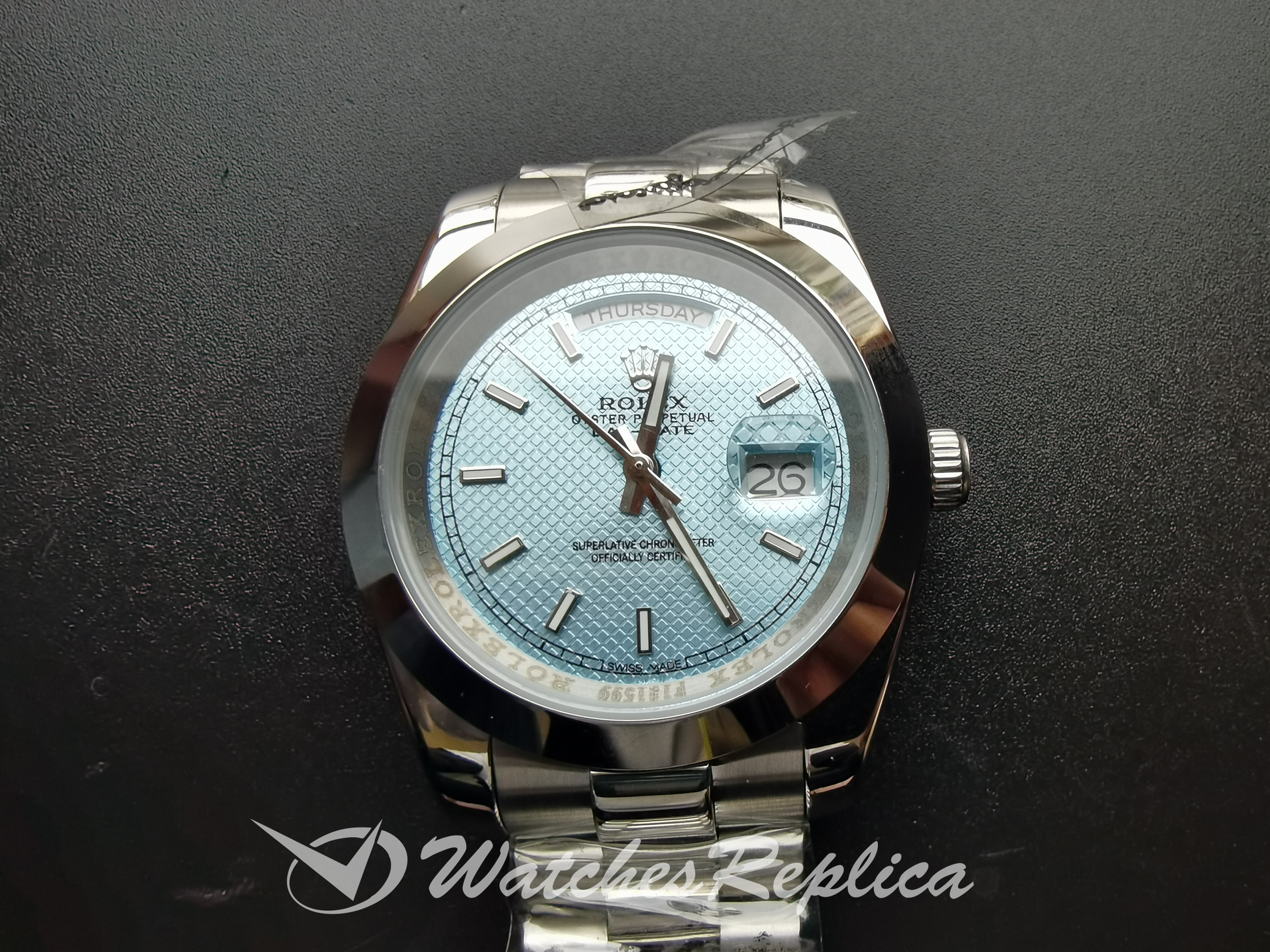 Exquisite Rolex Day-Date watch impresses with its 40mm platinum case, ice blue dial, and rugged design. Its automatic movement ensures precision, while the platinum bracelet adds a touch of luxury. Perfect for discerning gentlemen seeking a timepiece that combines style, functionality, and durability.